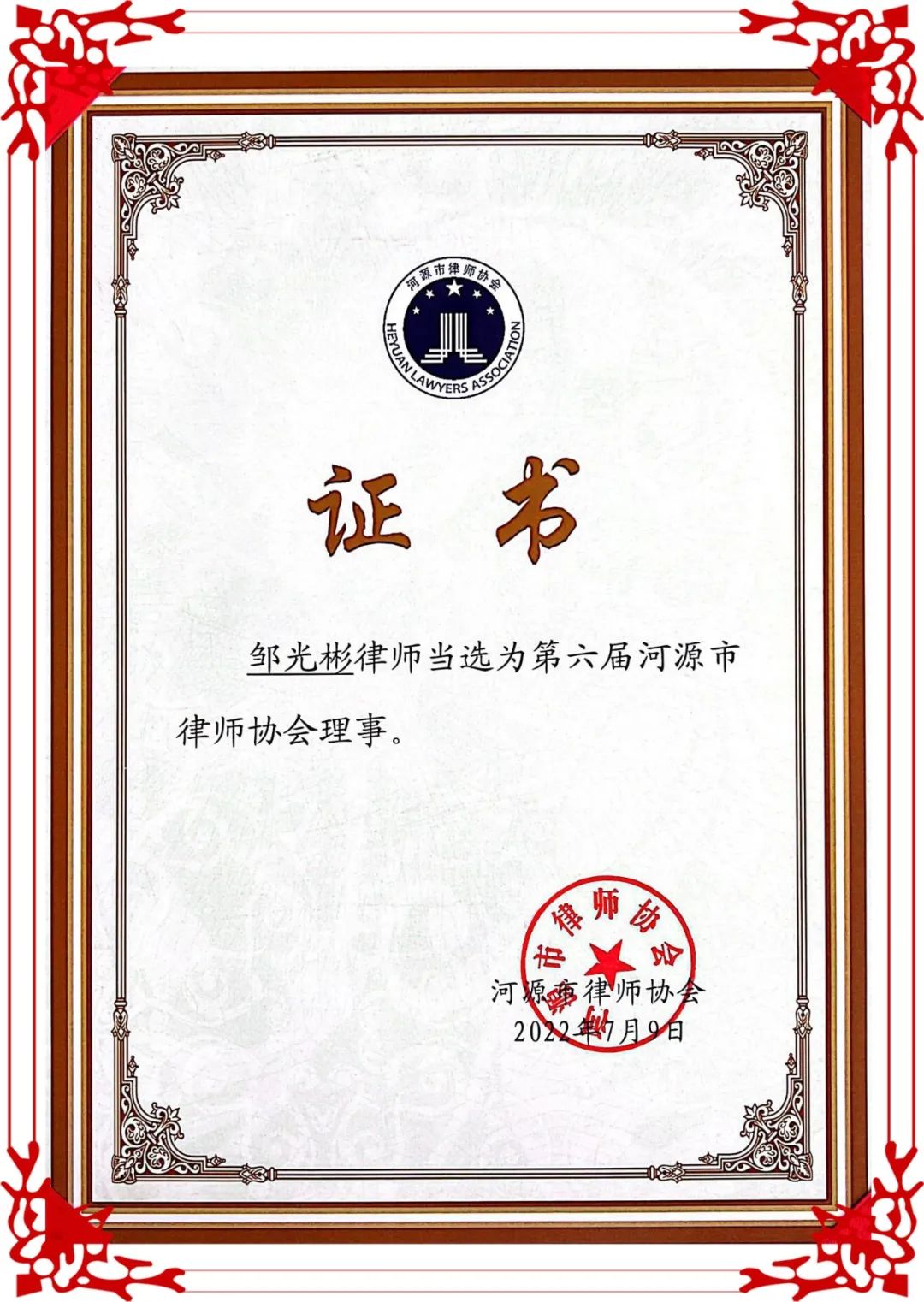 邹光彬因在河源市第五届律师协会的付出,河源市律协為(wèi)表达感謝(xiè),还特别授予了“突出贡献奖”